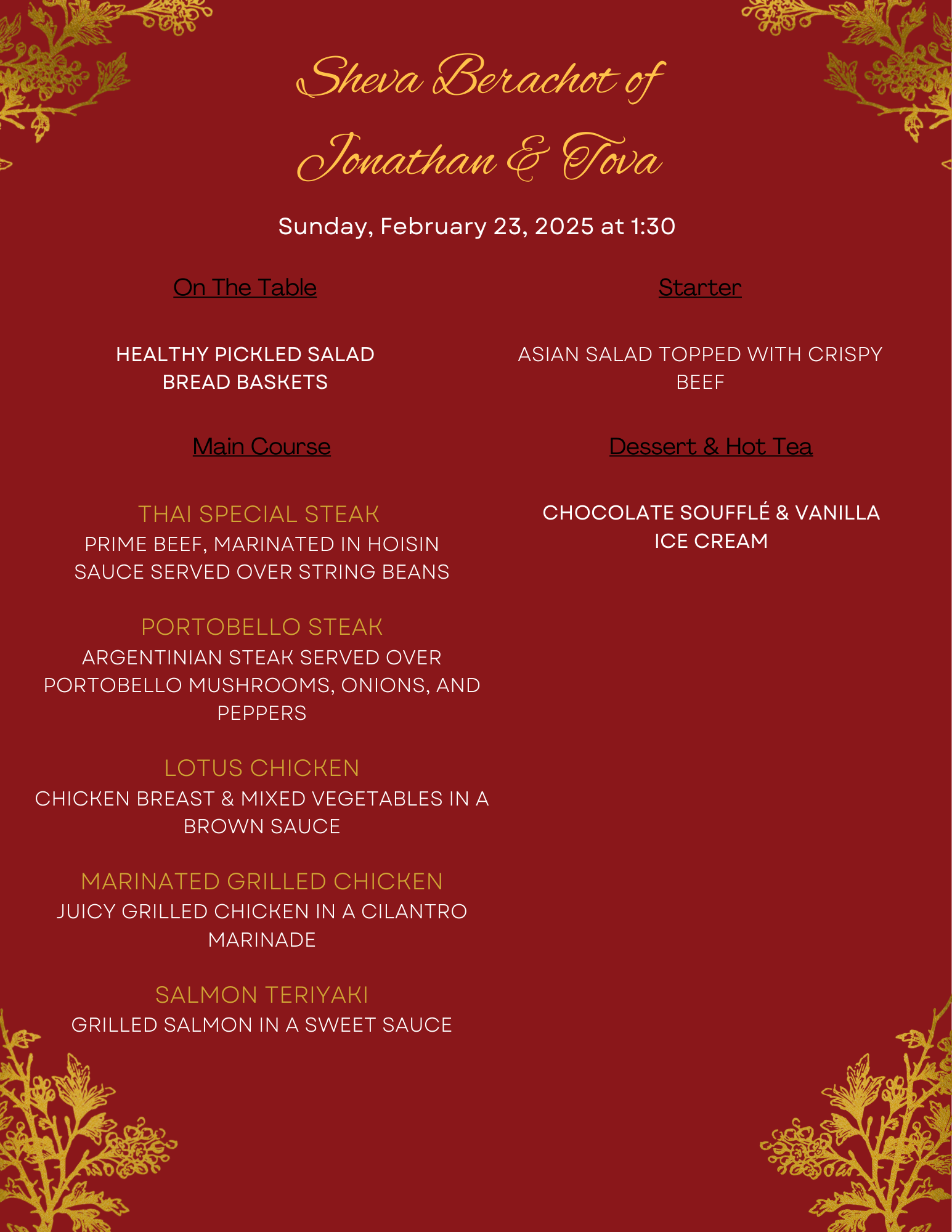 We are kosher certified so you can be sure our Glatt Kosher dining is prepared correctly. Our servers are happy to answer any questions about the menu and food preparation process too. Over our years in business, we’ve cooked for every palate and diet. Vegetarians will find plenty of meatless choices, and even picky eaters are pleased with the variety of options and cuisines we offer.
